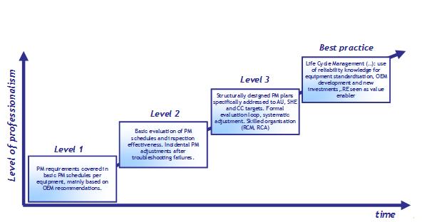 As an organisation becomes more mature in its level of reliability competency, their will be more focus on the total life cycle of assets. This will drive more involvement in investment and acquisition decisions based on sound knowledge and data. Equipment will be specified more frequently using reliability and maintainability criteria that meet the desired performance levels of the business. There will be closer working and transferring of information with suppliers and OEM’s to drive up standards of components and systems. More complex techniques, simulation modelling and scenario planning may be a requirement for more complex systems.