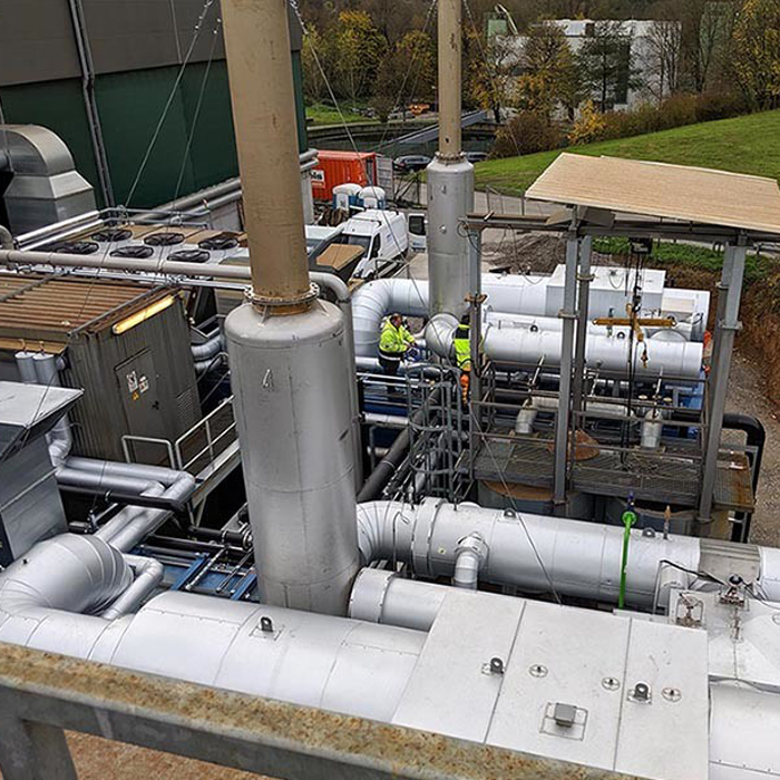 To reduce nitrogen oxides, Adblue must be injected into the exhaust system - this mixture has a urea content of 32.5 percent. The high exhaust gas temperature converts Adblue into ammonia. The ammonia reacts with the nitrogen oxides on the catalytic surface of the catalyst elements with the following reaction formula: 4NO + 4NH3 + O2 4N2 + 6H2O ETW Energietechnik has already installed some of the SCR catalytic converter elements. These reduce - even without urea injection - formaldehyde in the exhaust gas. Formaldehyde (CH2O) is converted into water and CO2. The complete SCR catalytic converter system including urea injection will not go into operation until 2023. In order to comply with the stricter limits, only minor retrofitting is then required due to the modern exhaust gas cleaning system (see below).