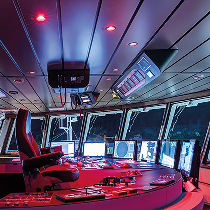 Glamox has supplied its DL60-R92 nightlight (red light) for the wheelhouse of Ronja Storm. The design of the downlight, with the red light source placed in the back/top of the housing, ensures there is no glare in the windows. The light is only used to illuminate the instruments, something which offers perfect visual conditions for the captain. The use of Dali enables the nightlight to be dimmed and adjusted to provide the best visibility at all times.