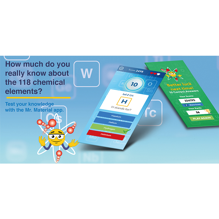 Mr. Material was originally created to celebrate the 150th anniversary of Mendeleev’s periodic table, an iconic and vital tool for anybody in the scientific community, whether you’re a student, researcher, teacher or just have a general interest in science. It’s an interactive, fun and free game aimed at testing the user’s scientific knowledge on the periodic table and all 118 elements.