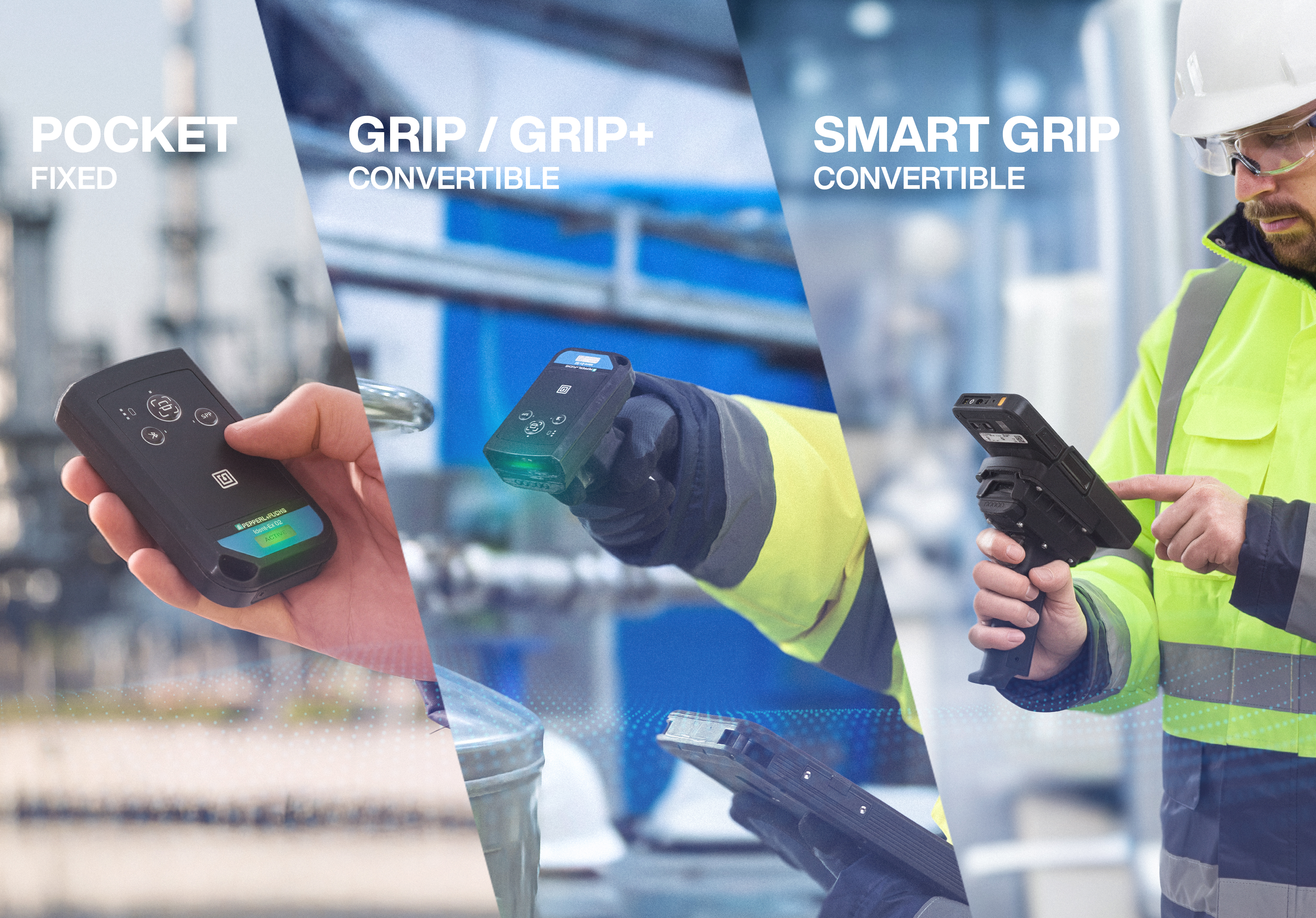 To meet a wide range of scanning requirements, the Ident-Ex® 02 is available in four different variants: Pocket, Grip, Grip+, and Smart Grip. The basis for all configurations is the Pocket version, a small, handy pocket-sized scanner – the lightest and smallest wireless barcode scanner for Zone 1/21 on the market. The Grip and Grip+ versions complement the compact Pocket scanner with an ergonomic pistol grip with magnetic and optional in-zone charging function.