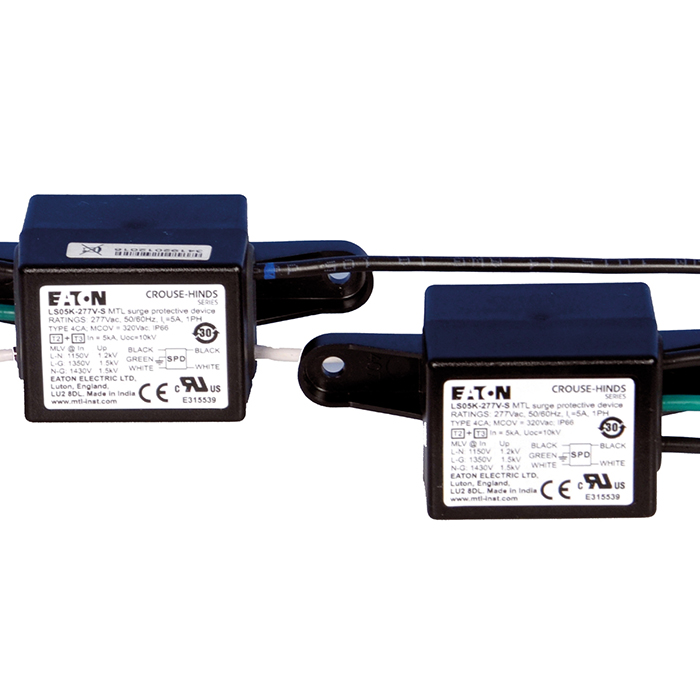 The MTL LS05K range of surge protection devices from Eaton has been designed to prevent damage or failure of LED systems as a result of transient over voltages due to lightning strike or switching surges in diverse industrial and commercial applications. MTL LS05K devices are equipped with internal overcurrent and thermal fuses and can endure large over-voltage swings that would damage most other SPDs. They provide protection with a maximum surge rating of 10kA (8/20µs) between Line/Neutral, Line/Ground and Neutral/Ground modes and offer a high performance-to-size ratio for 120V-277V, 347V and 440-480V systems.