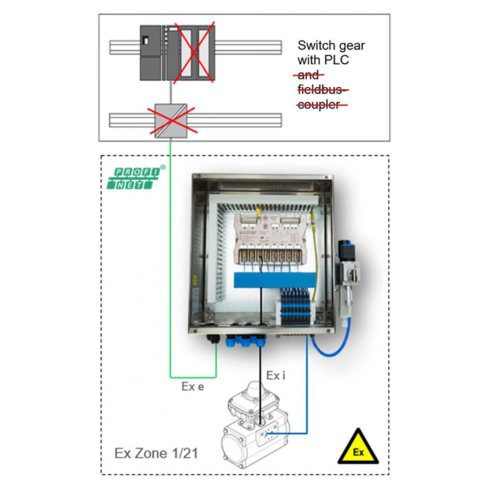 The new concept for zoned areas is: Place small Remote IO valve terminals distributed within a system instead of building central or large decentralized solutions. The aim is to collect the intrinsically safe signals on-site and to supply the pneumatic drives decentrally via short pneumatic lines. From there, communication takes place directly via PROFINET to the controller.